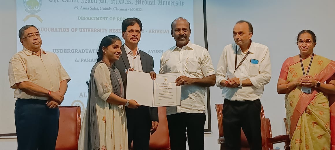 Students of Kamalakshi Pandurangan College of Pharmacy, Tiruvannamalai proudly congratulate Ms. S. Jemimah for securing Third Place in the Researcher Award among undergraduate pharmacy students at the University Research Day 2025, held at TNMGRMU, Chennai on 26.09.2025.